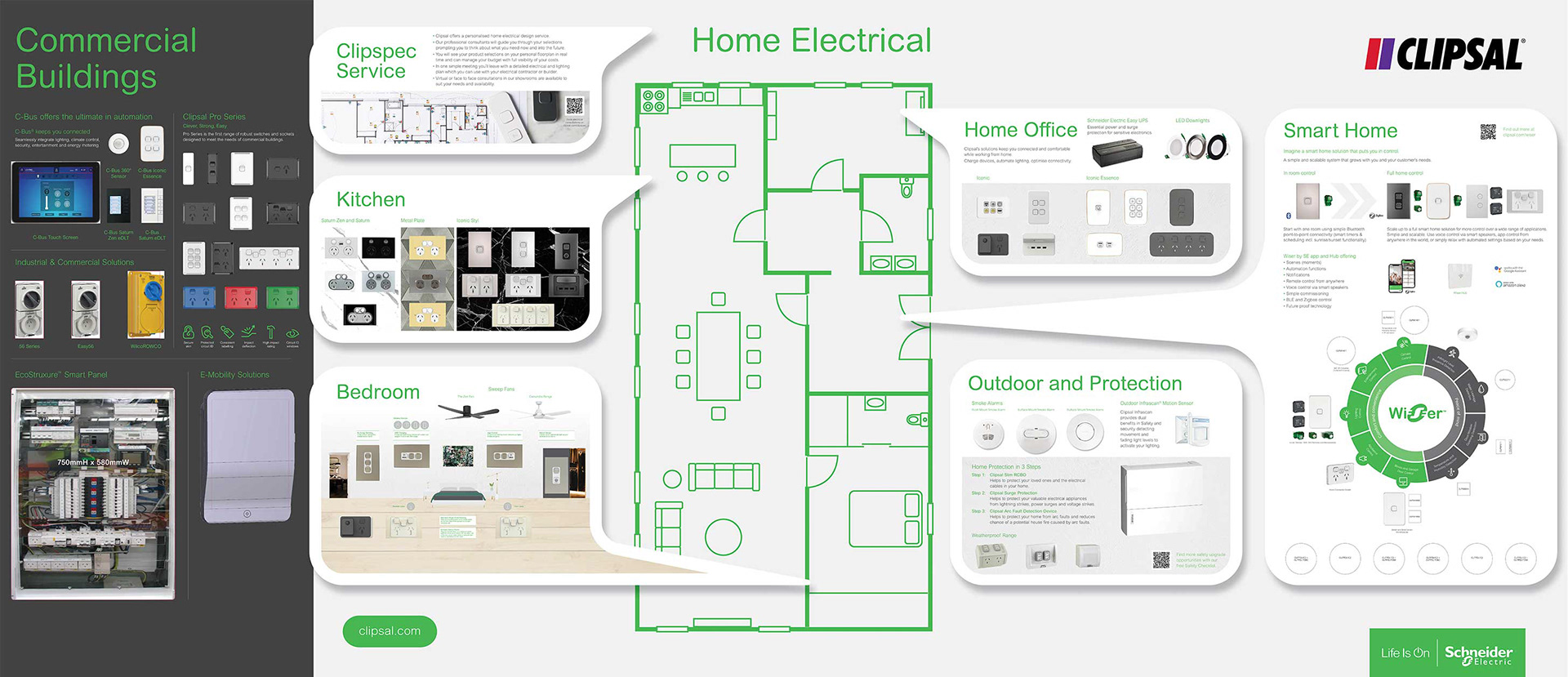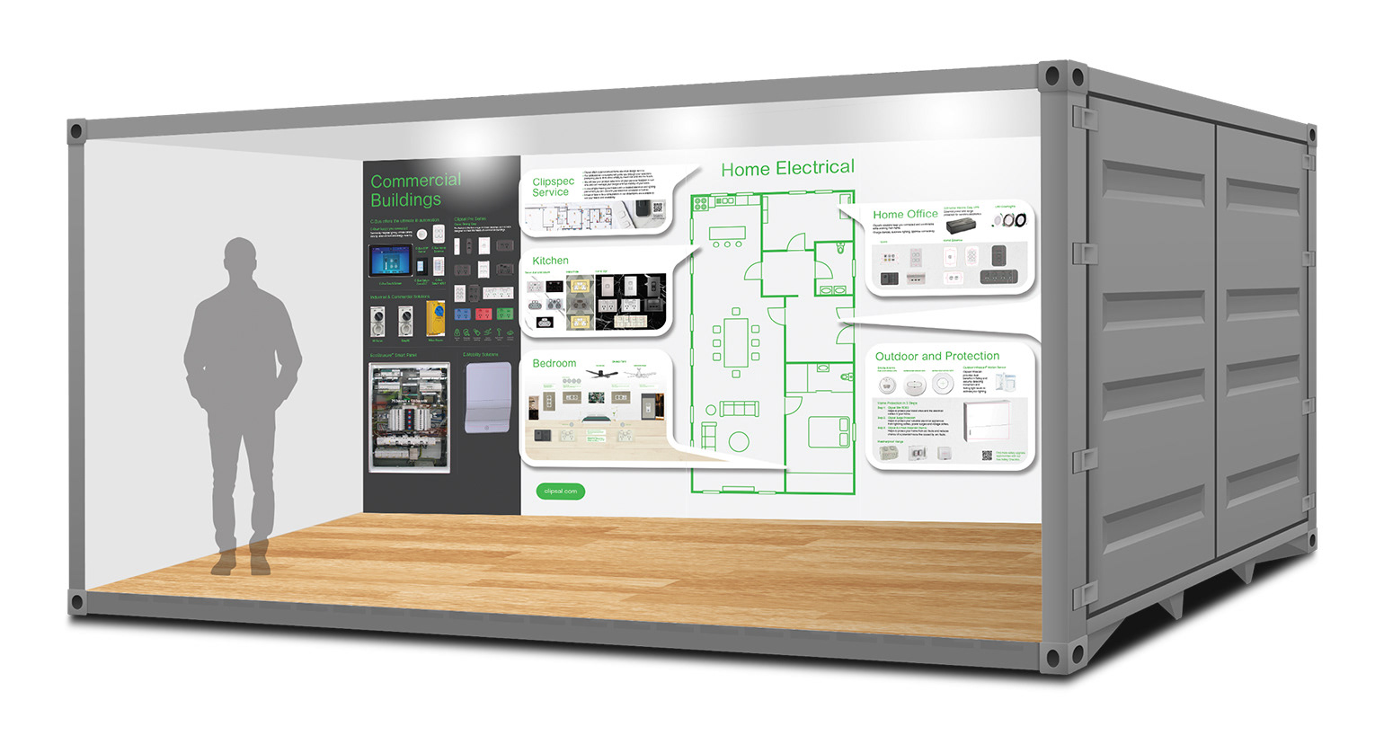 Internal shipping container wall features fitted products, displaying Clipsal’s wide range of commercial and home electrical products.